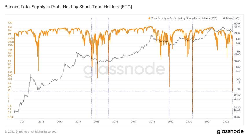 O indicador relacionado de Oferta Total em Lucro por STH fornece uma interpretação semelhante. Ao gerar fundos históricos no preço do BTC, este indicador sofreu aprofundamento e quedas de curto prazo em direção ao nível 0.