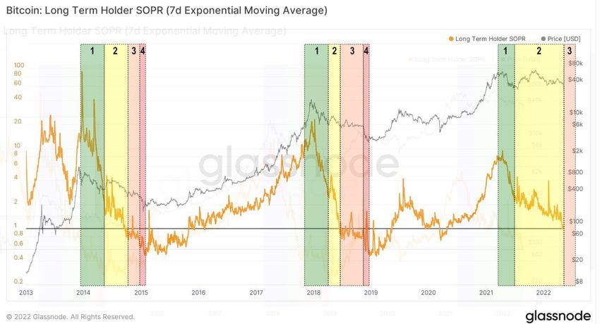 É importante observar que, atualmente, o gráfico da EMA de 7 dias para SOPR LTH está em uma posição crítica exatamente no nível 1. Se essa área for perdida, devemos esperar o início da fase 3. No entanto, se foram defendidos, então talvez o Bitcoin evitasse um mercado de baixa de longo prazo.