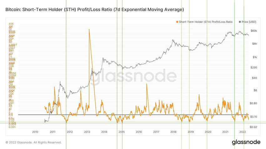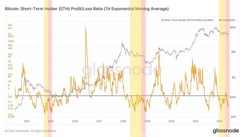 Esta última relação foi bem ilustrada pelo analista on-chain @SwellCycle, que tuittou um gráfico da média móvel exponencial de 7 dias (EMA) para o STH P/L Ratio logo após o BTC cair perto do nível de US$ 30.000. No gráfico, ele marcou com duas cores os períodos em que o indicador atingiu o fundo e os vinculou ao preço do BTC (áreas amarela e vermelha):