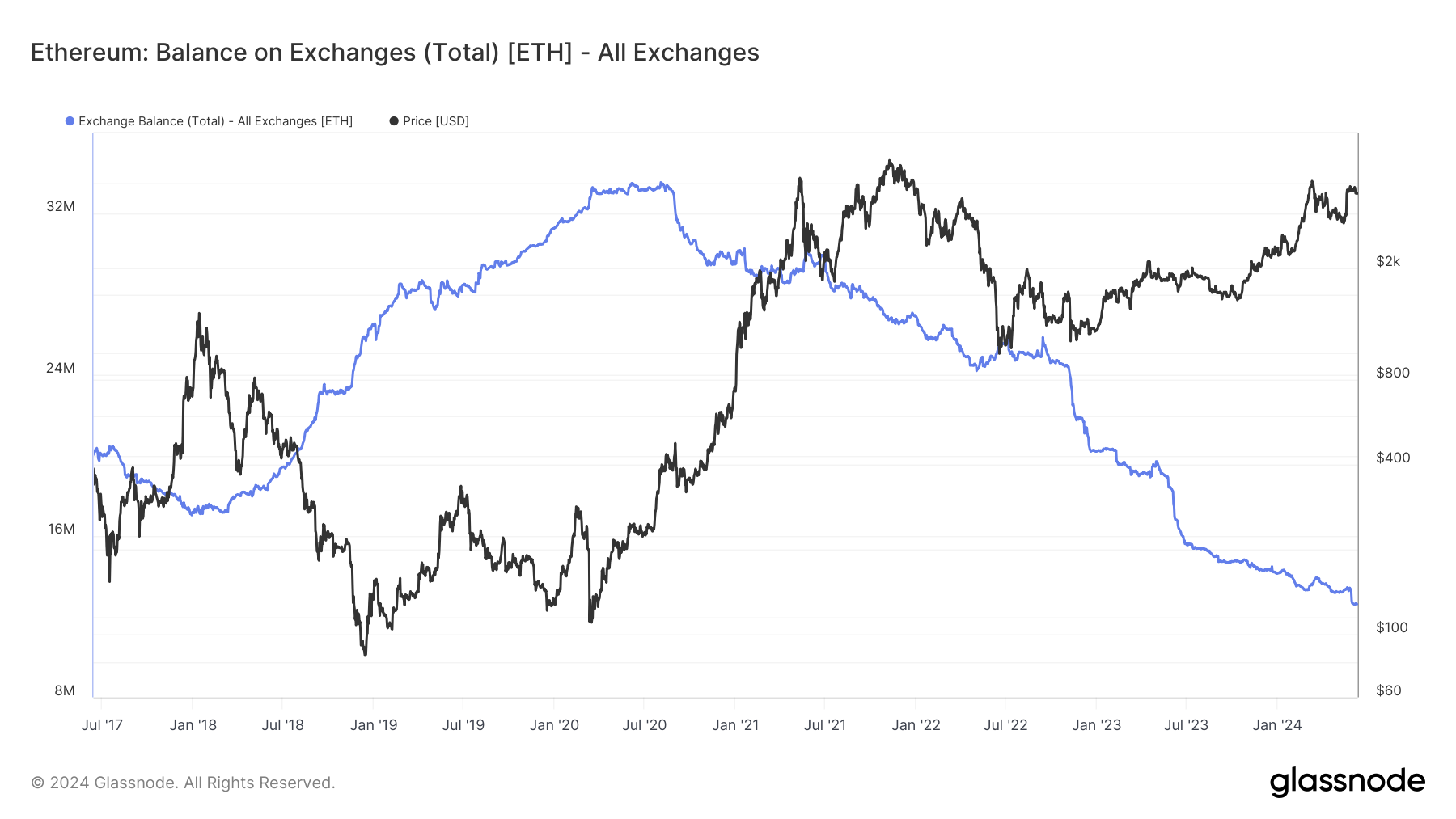 Ao mesmo tempo, a disponibilidade do Ethereum em exchanges de criptomoedas diminuiu significativamente, atingindo uma baixa de sete anos, conforme relatado pelos dados on-chain da Glassnode. O investidor Lark Davis, em seguida, explicou essa tendência.