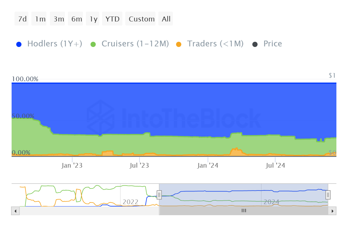 O impulso macro para Shiba Inu é também cada vez mais otimista, impulsionado na maioria pelas ações dos detentores de longo prazo (LTHs). Esses investidores geralmente mantêm seus tokens por mais de um ano, proporcionando estabilidade e reduzindo a volatilidade do mercado. Atualmente, os LTHs controlam 74% de todos os tokens SHIB em circulação, um número que enfatiza sua forte crença no futuro da moeda.