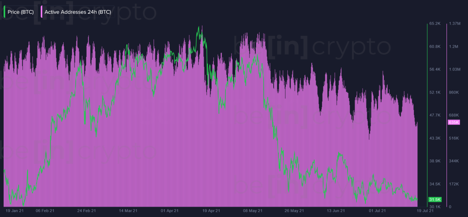 A queda no interesse pelo Bitcoin também é indicada pela redução no número de endereços exclusivos em contato com a criptomoeda. Desde o dia 12 de julho, o número de endereços que interagiram com o ativo caiu 28%.
