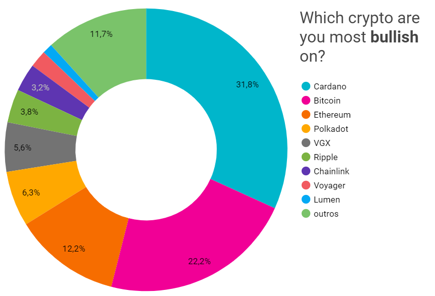SponsoredCom 31,8% dos entrevistados elegendo a Cardano como a criptomoeda mais promissora, ela sai na frente inclusive do próprio Bitcoin (BTC) que ficou em segundo lugar com 22,2%.