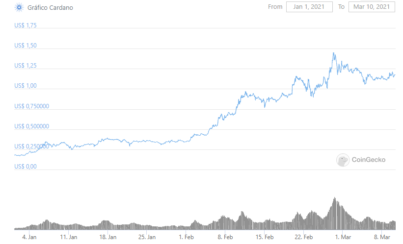 Entretanto, quando começou 2021 a Cardano decolou e no final de fevereiro, já acumulava uma valorização de 770%. Abrindo o ano valendo US$ 0.17, em menos de dois meses a ADA já havia aumentado seu preço em oito vezes ao alcançar no dia 27 de fevereiro a sua máxima de todos os tempos de US$ 1.48.