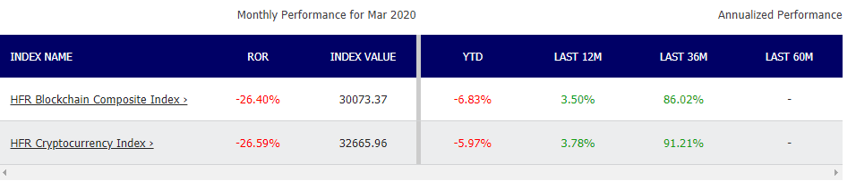 HedgeFundResearch.com também rastreia o desempenho de fundos de hedge com exposição ao blockchain e criptomoedas.
