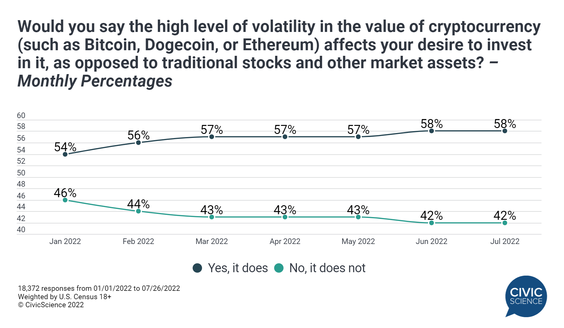 Mantendo o índice da pesquisa no mês anterior, 58% dos entrevistados responderam que a volatilidade é o principal fator que os faz decidir entre investir no mercado de criptomoedas e no mercado de ações e outros ativos. Revelando que o mercado cripto está amadurecendo à medida que cresce.
