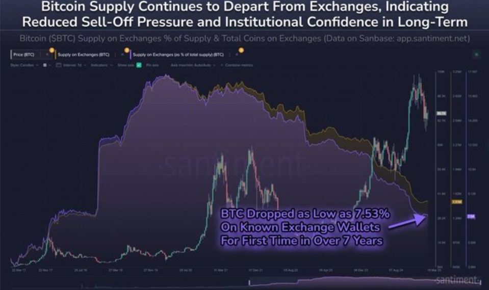 No entanto, apesar da luta do BTC para capturar fluxos institucionais de porto seguro, sua narrativa de longo prazo permanece intacta. Isso é visto com a oferta de Bitcoin nas exchanges caindo para apenas 7,53%, o menor nível desde fevereiro de 2018.