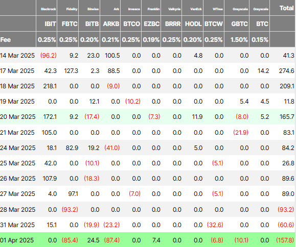 ETFs de Bitcoin (exchange-traded funds) continuam registrando fluxos negativos nesta semana enquanto a contagem regressiva para o Dia da Libertação do Presidente Donald Trump continua.
