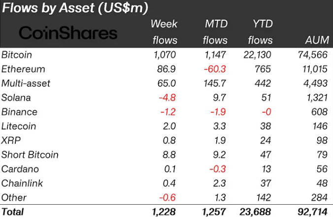 Produtos de investimento em ativos digitais registraram entradas de US$ 1,2 bilhões na última semana. O Bitcoin liderou, registrando US$ 1,070 bilhões em fluxos positivos.