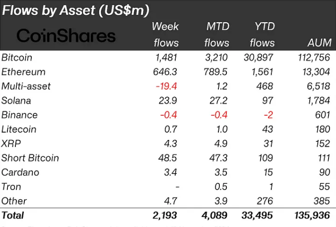 O Ethereum, que havia enfrentado saídas nas semanas anteriores, se recuperou fortemente com US$ 646 milhões em influxos. Esse ressurgimento é atribuído ao renovado otimismo dos investidores após a proposta de atualização Beam Chain de Justin Drake e o sentimento pró-cripto mais amplo impulsionado pela vitória republicana.