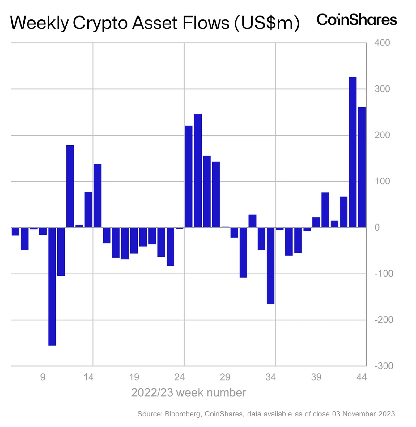 Durante essas seis semanas, houve uma entrada total de US$ 767 milhões. Curiosamente, é mais do que as entradas totais para todo o ano de 2022, com US$ 736 milhões.