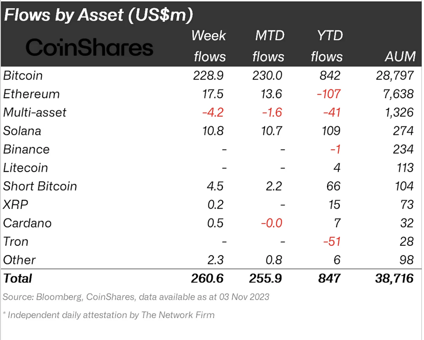 Do total de entradas na semana passada, o Bitcoin recebeu mais de 85% da participação, com quase US$ 229 milhões em entradas. Houve uma entrada de US$ 17,5 milhões em Ethereum (ETH), a maior desde agosto de 2022. Já Solana, cujo preço quase dobrou desde o mês passado, teve uma entrada de US$ 10,8 milhões.
