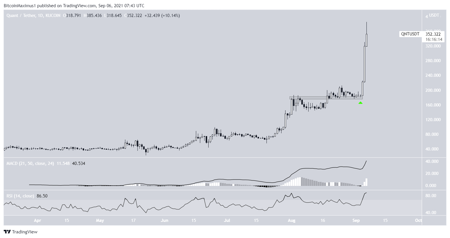 O QNT está crescendo rapidamente desde o dia 20 de julho. Depois de sair da área de resistência de US$ 180 no dia 28 de agosto, a criptomoeda validou essa área como suporte ao longo dos dez dias seguintes.