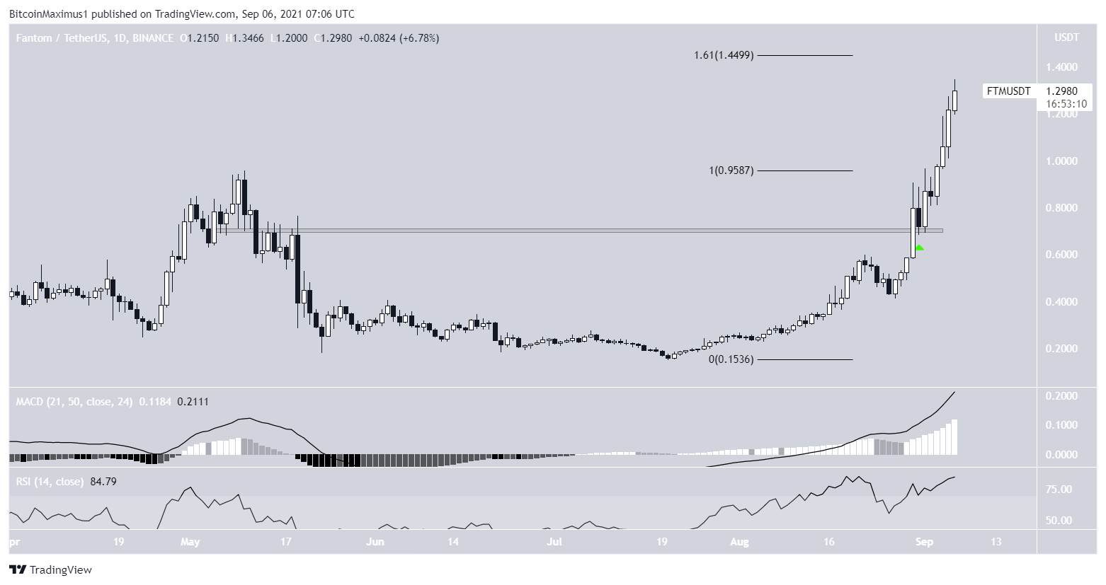 No dia 30 de agosto, o FTM ultrapassou a área de resistência horizontal de US$ 0,705. A criptomoeda validou essa área como suporte no dia seguinte (ícone verde) e está crescendo desde então.