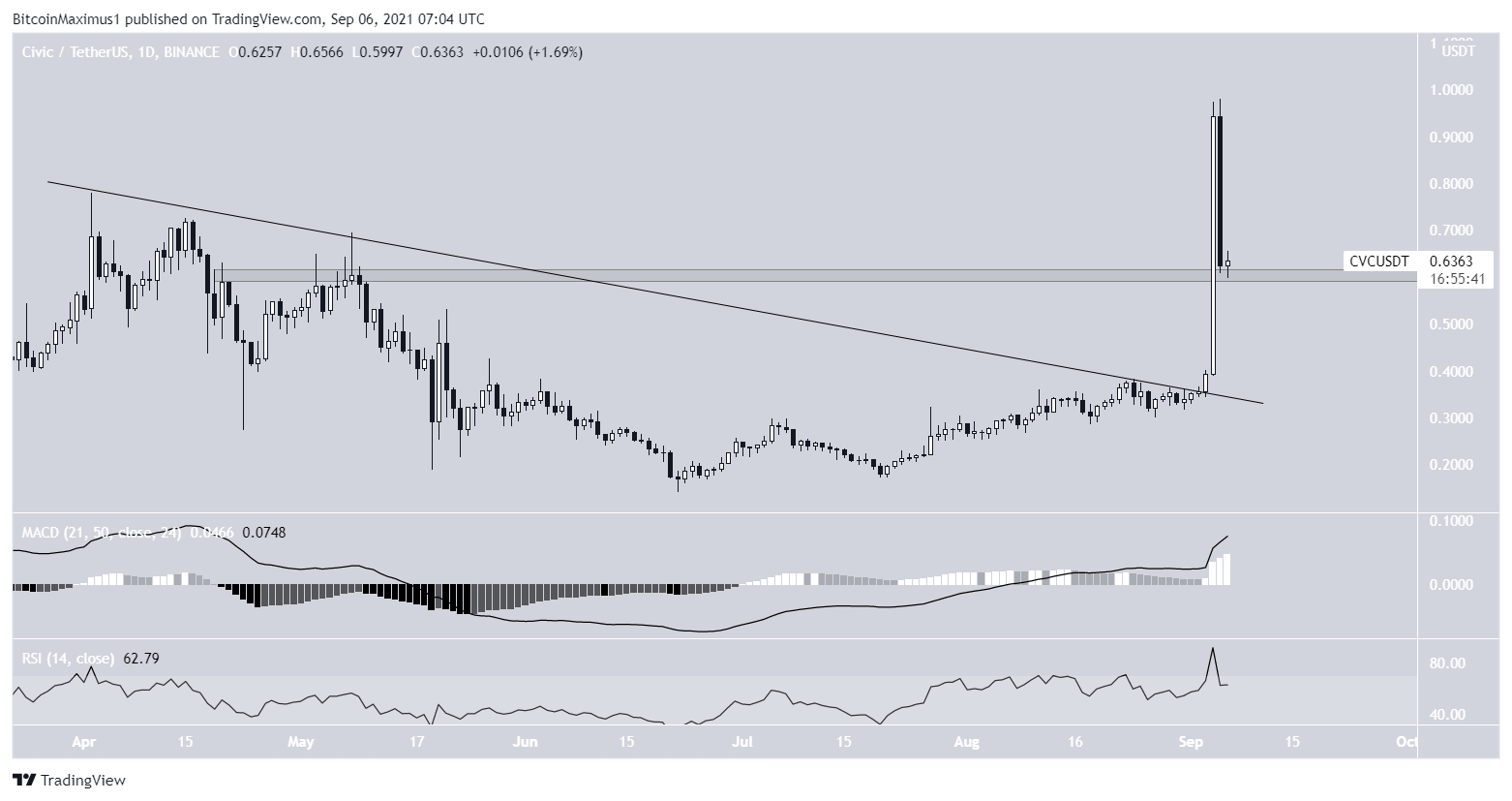 Semelhante à ROSE, o CVC tentou romper uma linha de tendência de baixa no dia 24 de agosto. Após a rejeição inicial, a criptomoeda foi capaz disso na última sexta-feira (3).