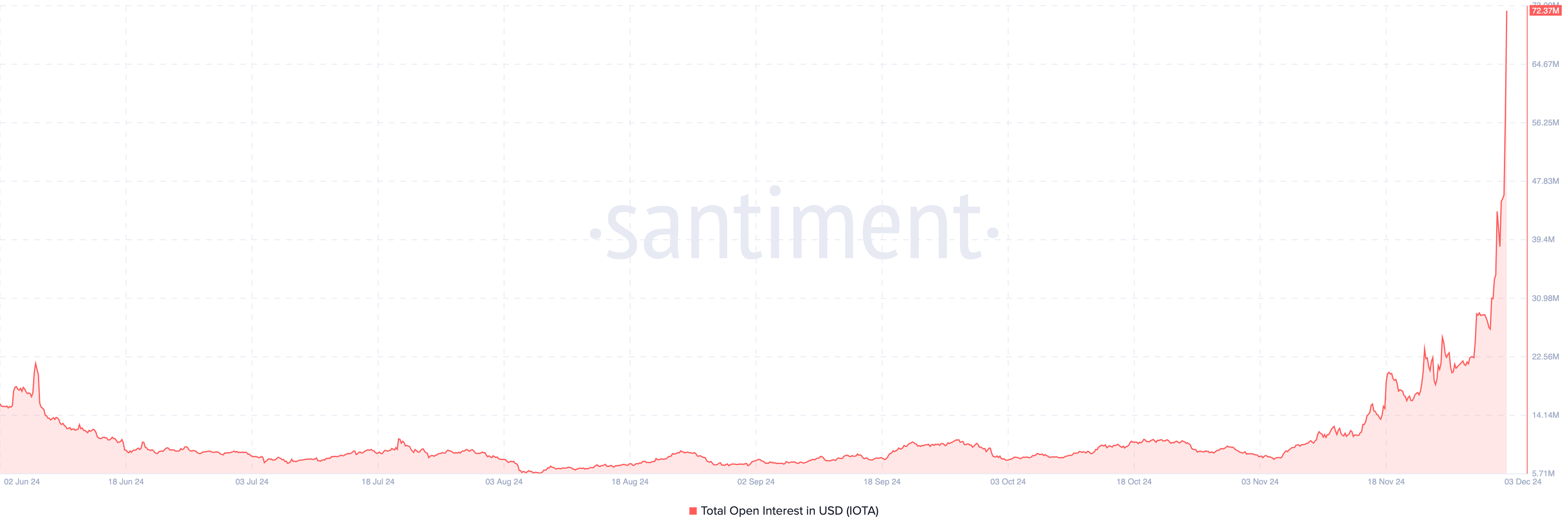 Se o volume continuar a subir junto com o preço, a IOTA pode valer mais de US$ 0,48 em poucos dias. Além do volume, o Open Interest (OI) da IOTA também subiu para US$ 72,37 milhões. O OI mede o nível de atividade especulativa em torno de uma criptomoeda.