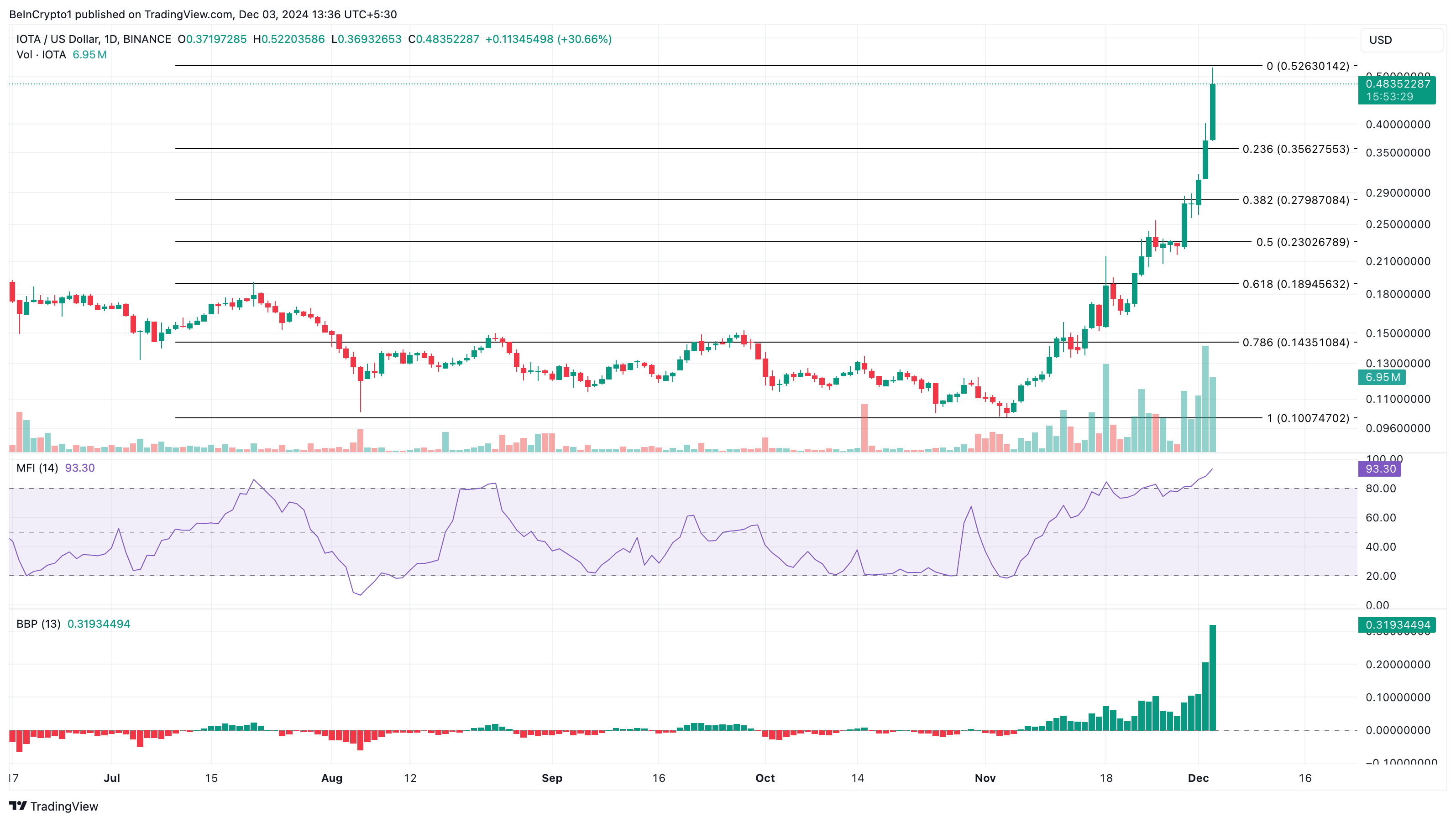 Por outro lado, se o BBP for negativo, significa que os ursos têm a vantagem, e os preços podem aumentar. Para a IOTA, é o último caso. Além disso, o Índice de Fluxo de Dinheiro (MFI), que mostra o nível de entrada de capital em uma criptomoeda, subiu, indicando que a pressão de compra em torno do token está muito presente.