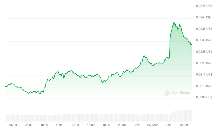 No momento da publicação, a altcoin recuou ligeiramente, mas está com grandes ganhos a US$ 0,02294, registrando assim um aumento de 42% na última semana, segundo dados do CoinGecko.