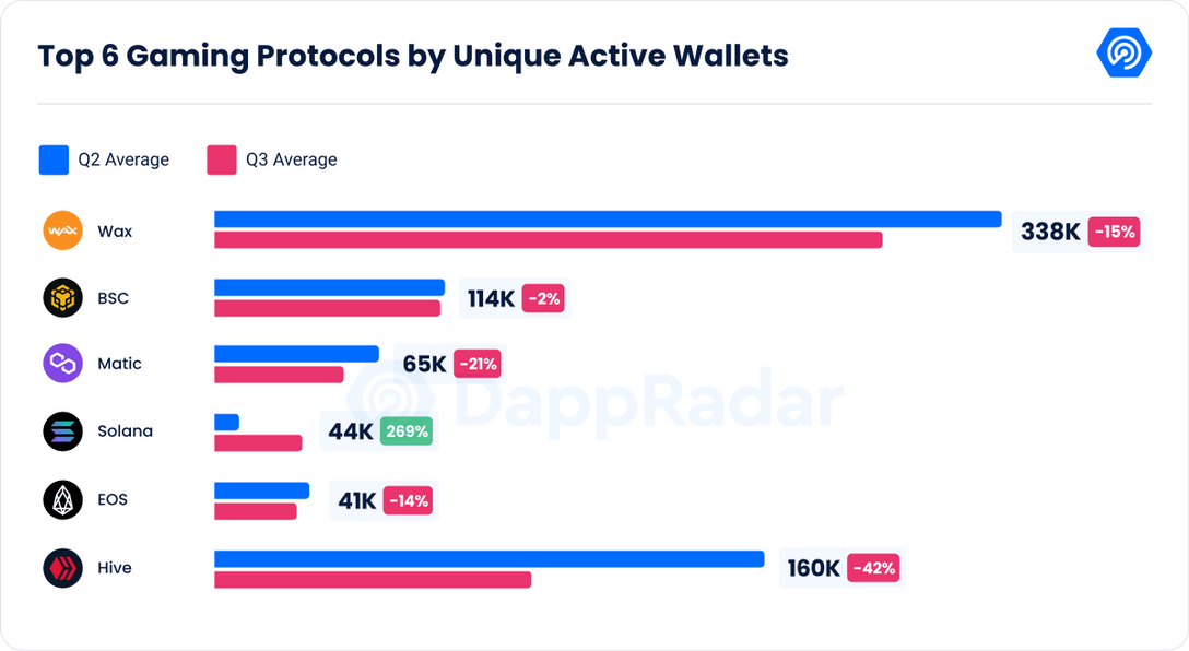 Dentre as seis principais blockchains usadas para projetos de jogos, Solana (SOL) foi a única que registrou um aumento em relação ao trimestre anterior, ganhando até 269% no número de carteiras ativas do segundo ao terceiro trimestre. Apesar da atividade de jogo ser baixa representando apenas 4,82% de toda a atividade que ocorre nessa rede.