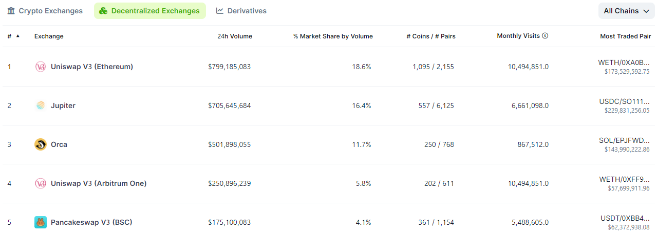 Seu volume aumentou ainda mais após o anúncio da Binance, chegando a marca de US$ 700 milhões nas últimas 24 horas. Apesar de ser superada pela Uniswap V3 no período, a DEX está bem longe da terceira colocada, a Orca.