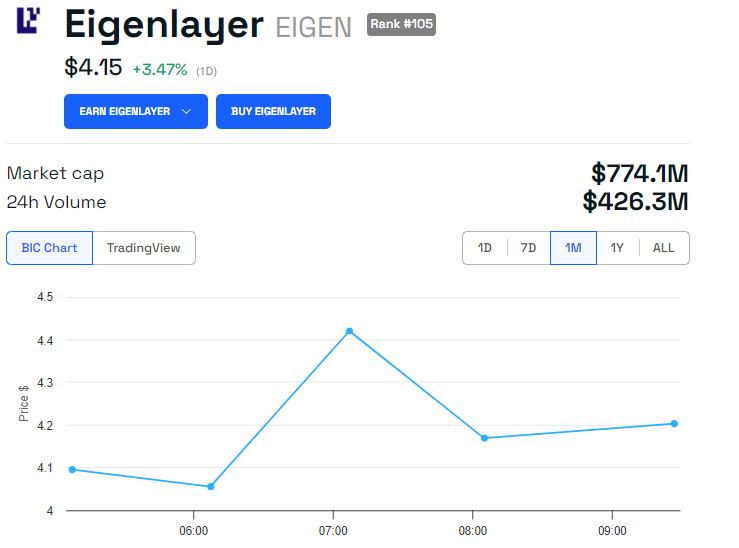Esse desenvolvimento posiciona a EigenLayer como uma “nuvem verificável para cripto,” abrindo oportunidades para sidechains, redes Oracle, pontes e mais. O token EIGEN está atualmente sendo negociado a US$ 4,15, refletindo um aumento de 3,47% desde a abertura da sessão de terça-feira.