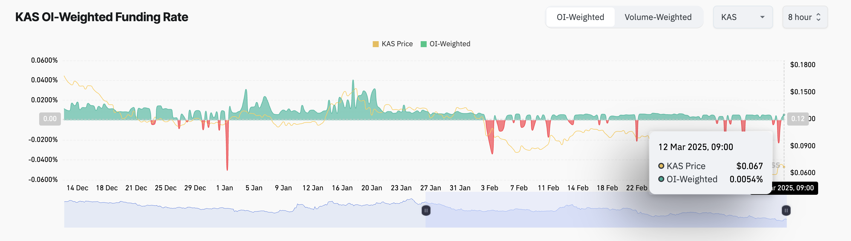 O interesse aberto refere-se ao número total de contratos derivativos em aberto que não foram liquidados. À medida que aumenta, sugere maior participação do mercado e novo capital entrando nas posições da KAS. Isso sinaliza confiança crescente na tendência de preço do ativo e sugere uma tendência de alta sustentada se continuar.