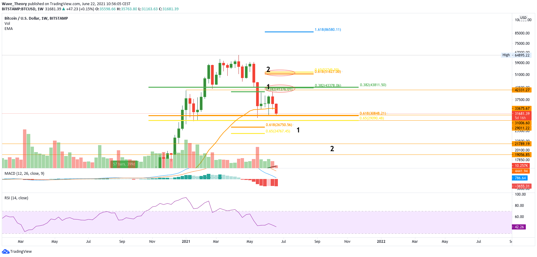 Pouco depois de atingir a máxima histórica de cerca de US$ 65.000, o Bitcoin já estava enfraquecendo. Seu preço atingiu a marca de US$ 58.000 pela última vez, momento em que ficou claro para mim, do ponto de vista técnico, que a tendência estava mudando. Como resultado, saí do mercado com a previsão de que o Bitcoin chegaria a US$ 30.000. Bem, isso foi há algumas semanas, mas agora o preço do BTC está novamente perto deste importante suporte de US$ 30.000.