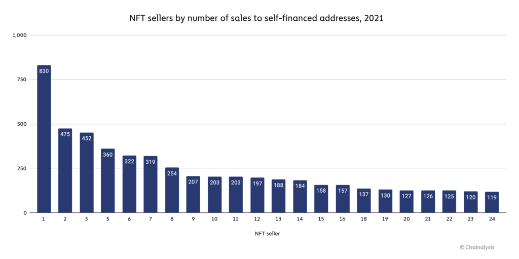 Com a análise de blockchain, no entanto, a Chainalysis pode rastrear a negociação de lavagem de NFT analisando as vendas de tokens para endereços que foram autofinanciados, o que significa que foram financiados pelo endereço de venda ou pelo endereço que financiou inicialmente o endereço de venda. A análise das vendas para endereços autofinanciados mostra que alguns vendedores de NFT realizaram centenas de transações de lavagem.