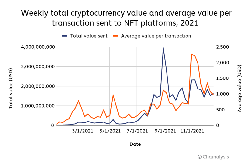 O valor enviado aos mercados NFT por endereços ilícitos saltou significativamente no terceiro trimestre de 2021, ultrapassando US$ 1 milhão em criptomoedas. O número cresceu novamente no quarto trimestre, chegando a pouco menos de US$ 1,4 milhão.