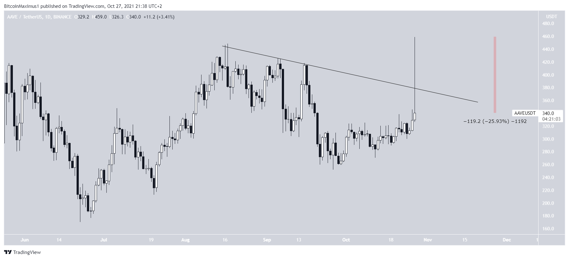 A AAVE está seguindo uma linha de tendência de baixa desde 17 de agosto. Na quarta-feira (27), o token fez uma tentativa de romper acima desta linha. No entanto, não teve sucesso e criou um longo pavio superior com uma magnitude de 27%.