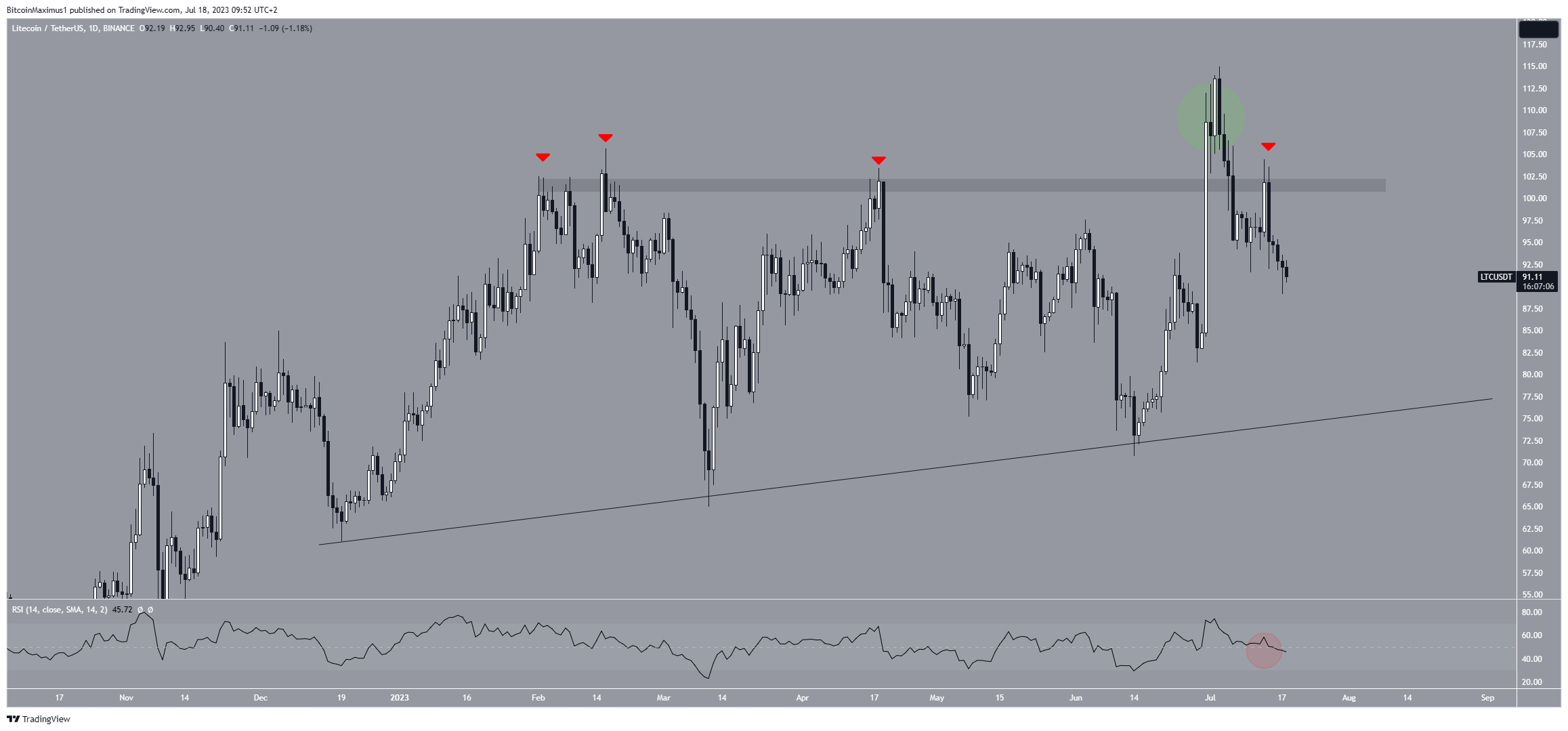 Apesar dessa previsão otimista de preço no curto prazo, uma quebra da cunha provavelmente catalisará uma queda da Litecoin para US$ 80.