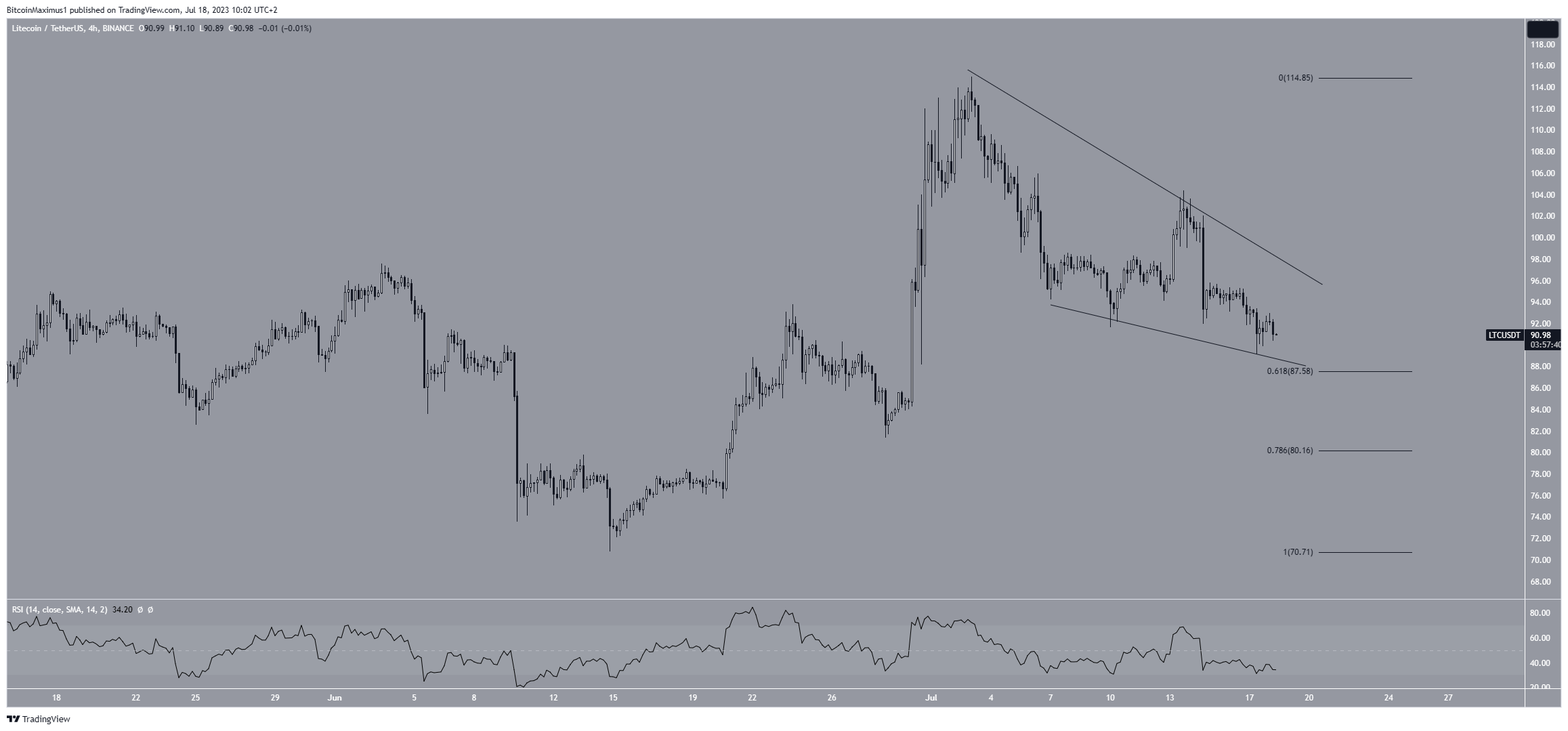 Além disso, o LTC está se aproximando de uma confluência de níveis de suporte criados pela linha de suporte da cunha e o nível de retração 0,618 de Fibonacci.