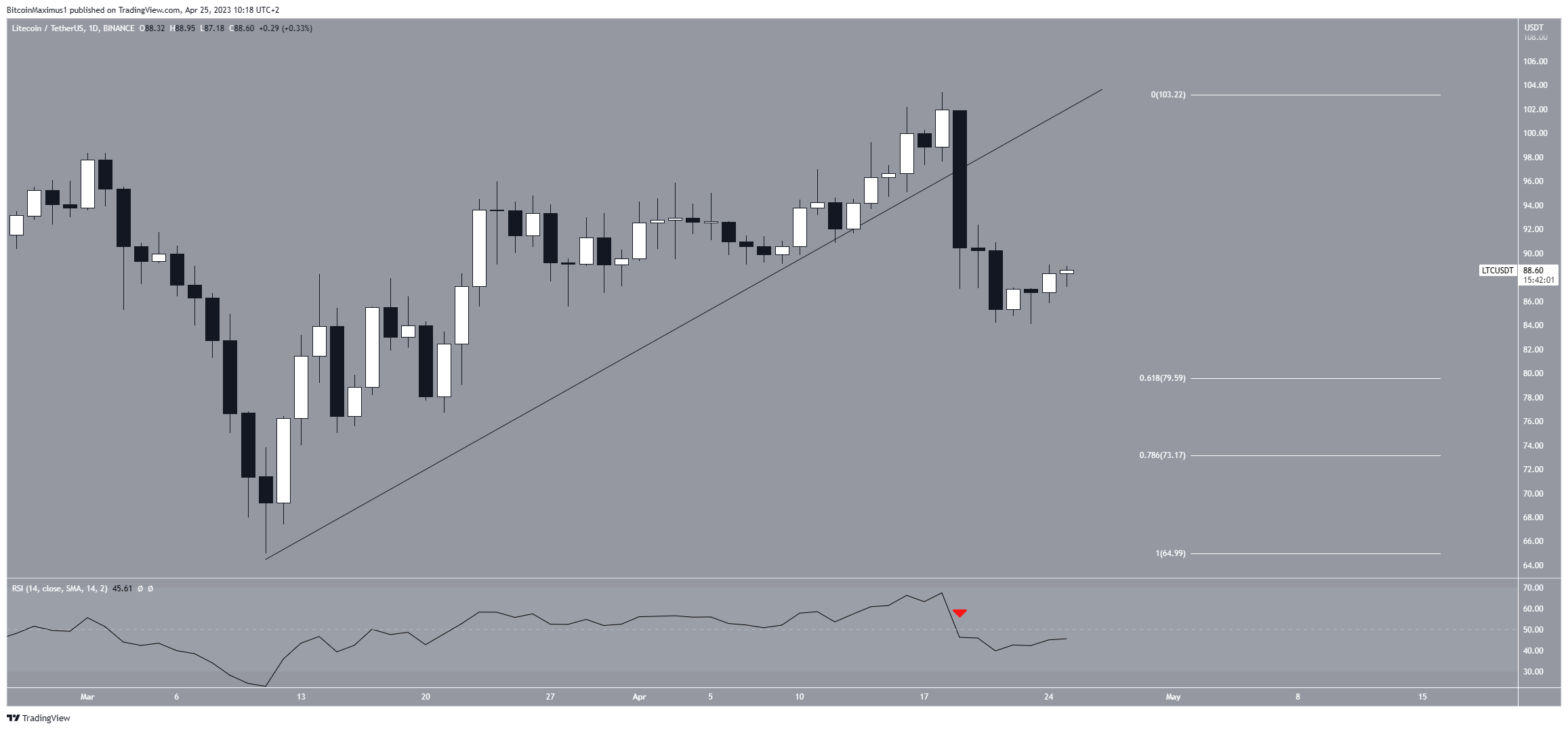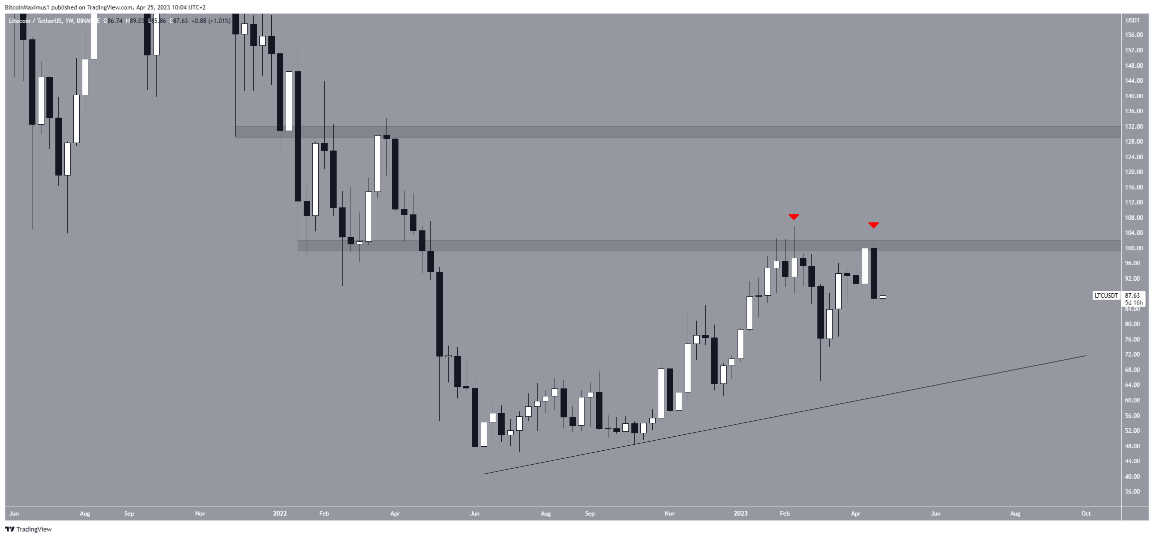O preço da LTC estava em alta desde junho de 2022. O movimento levou a uma máxima anual de US$ 105,70 em fevereiro. No entanto, o token não conseguiu superar a área de resistência horizontal de US$ 100. Em vez disso, foi rejeitado por esse nível duas vezes (ícones vermelhos). O movimento é considerado um sinal de baixa por vários motivos.
