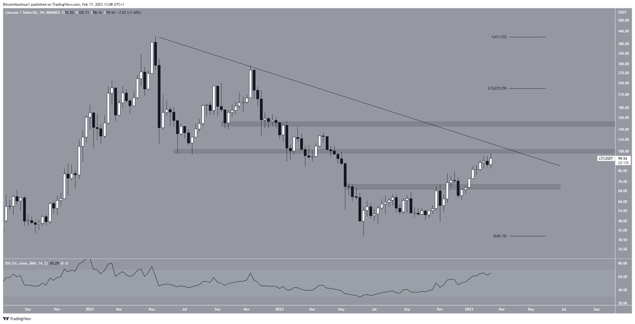 O histórico semanal de preços mostra que o Litecoin caiu abaixo de uma linha de tendência de baixa de longo prazo em maio de 2021. A queda resultou em uma mínima de US$ 40,30 feita em junho de 2022.
