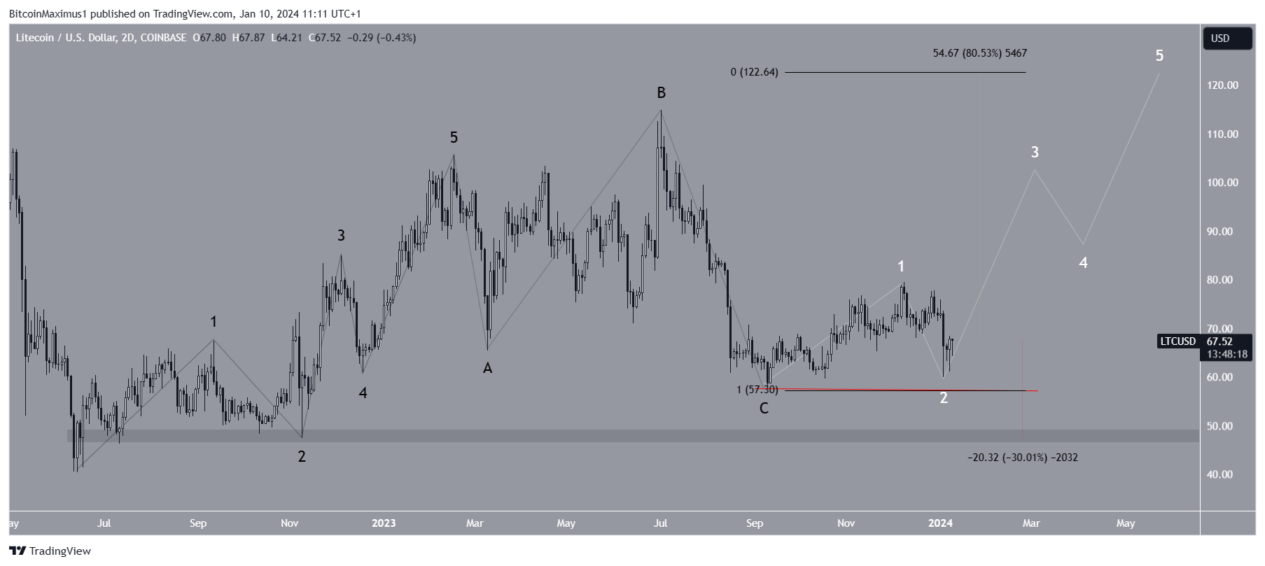 Nesse caso, a Litecoin iniciou outro movimento de alta (branco) em setembro de 2023. Se esses movimentos tiverem a mesma duração, o LTC subirá 80% e alcançará a próxima resistência em US$ 122.