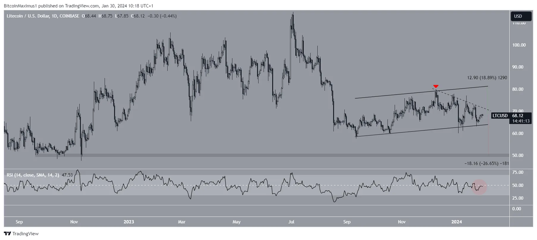 Além disso, o Litecoin seguiu uma linha de tendência de baixa (tracejada) desde a rejeição do canal em 9 de dezembro de 2023. Finalmente, o RSI diário está abaixo de 50 e caindo (círculo vermelho), ambos sinais de tendência de baixa.