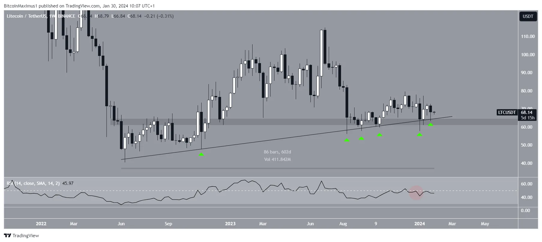A análise técnica do gráfico semanal mostra que o Litecoin subiu ao longo de uma linha de tendência de alta desde junho de 2022. A linha foi validada seis vezes (ícones verdes), a mais recente na semana passada.