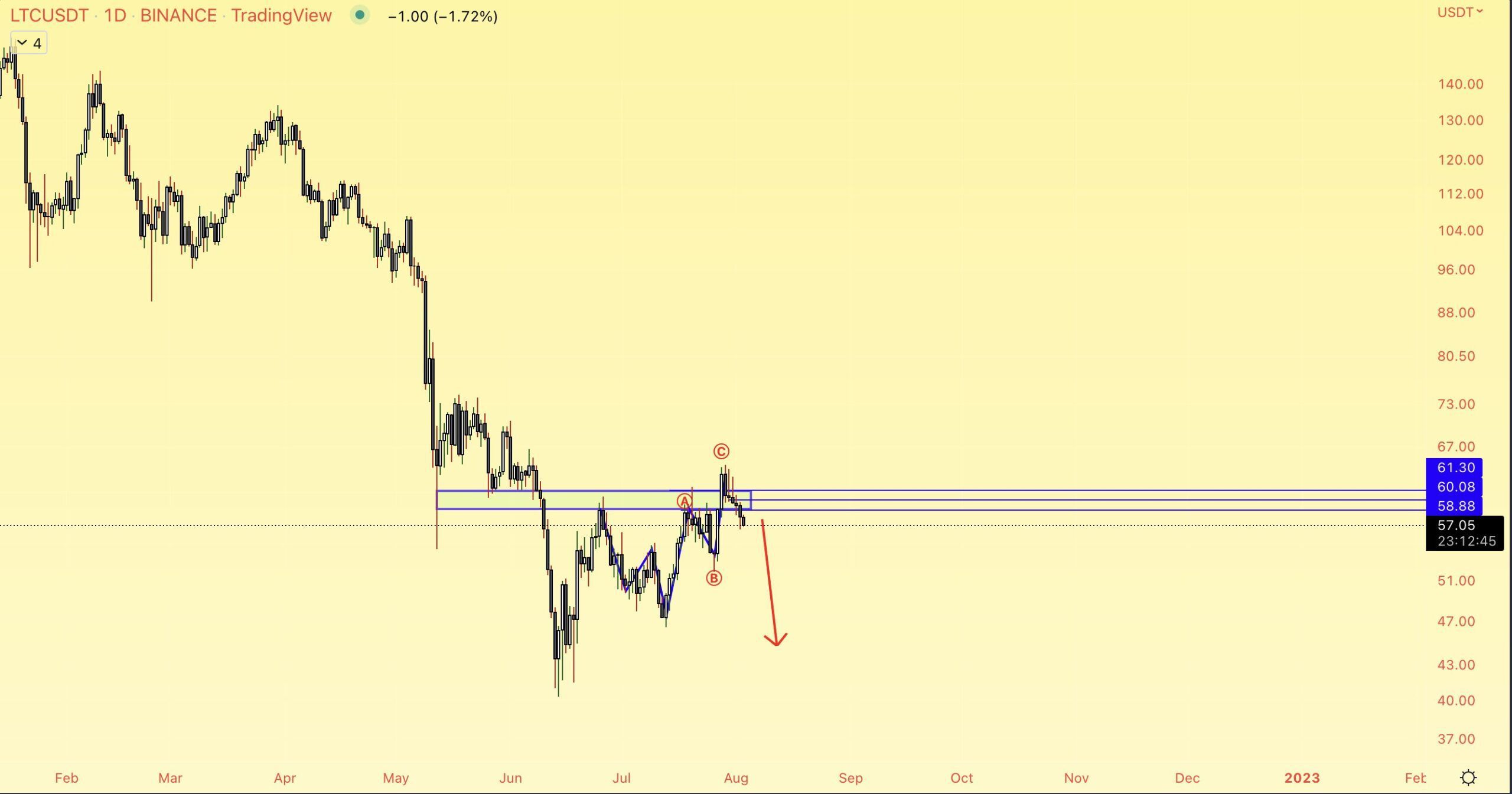 O trader de criptomoedas @Altstreetbet tuitou um gráfico para o LTC, afirmando que o movimento de alta foi corretivo e o preço agora está em uma tendência de baixa.