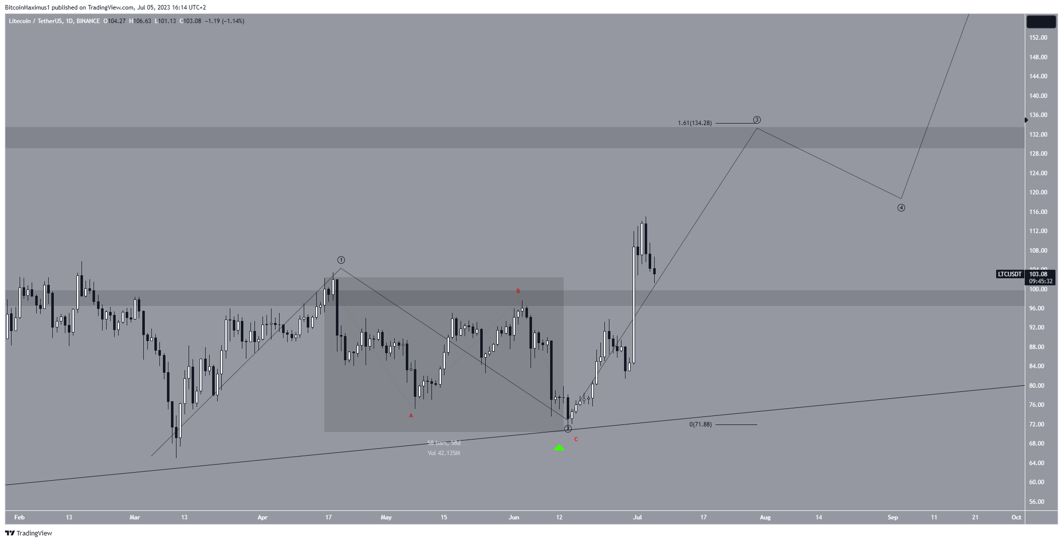 O alvo mais provável para o topo da onda três é de US$ 135, dando às ondas 1:3 uma proporção de 1:1,61. Isso também levaria o preço do LTC para a área de resistência de longo prazo de US$ 135, tornando provável que o preço atinja um topo local lá.