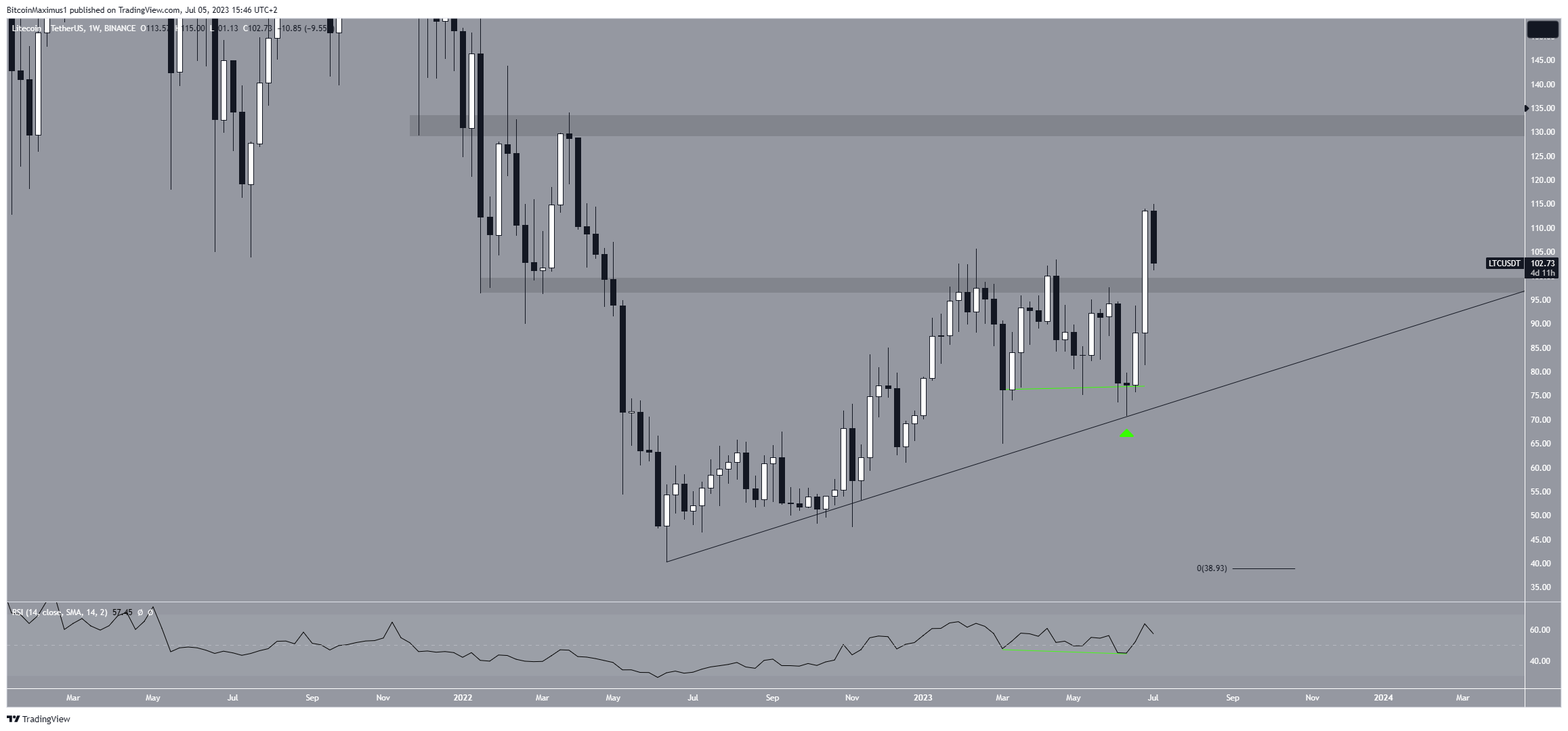 A análise técnica do gráfico semanal para o LTC oferece uma perspectiva predominantemente positiva. Existem vários fatores para isso. Para começar, o preço está dentro de um padrão de triângulo de alta desde maio de 2022.