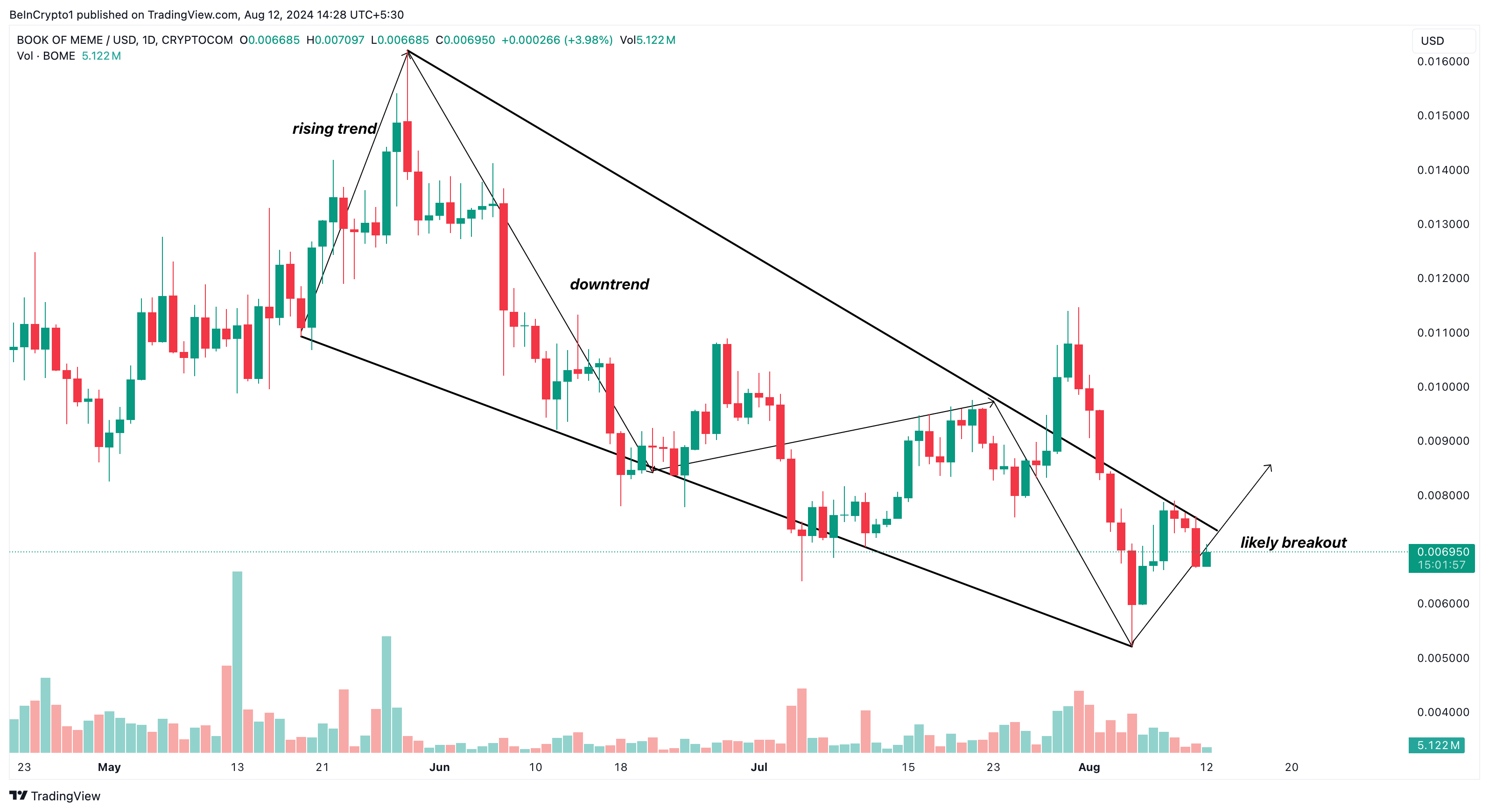 Esse padrão também contém um período de consolidação, após o qual ocorre um rompimento. Para o BOME, o token está à beira de outra tendência de alta, como mostrado abaixo.