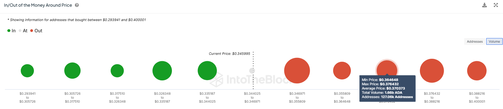 O indicador In/Out of the Money Around Price (IOMAP) revela que aproximadamente 3,6 bilhões de ADA, avaliados em mais de US$ 1,2 bilhão, foram comprados entre o preço atual e US$ 0,37. Esse grande volume de ADA significa que romper a resistência de US$ 0,37 poderia desbloquear ganhos significativos para os investidores, sendo crucial para lucros futuros.
