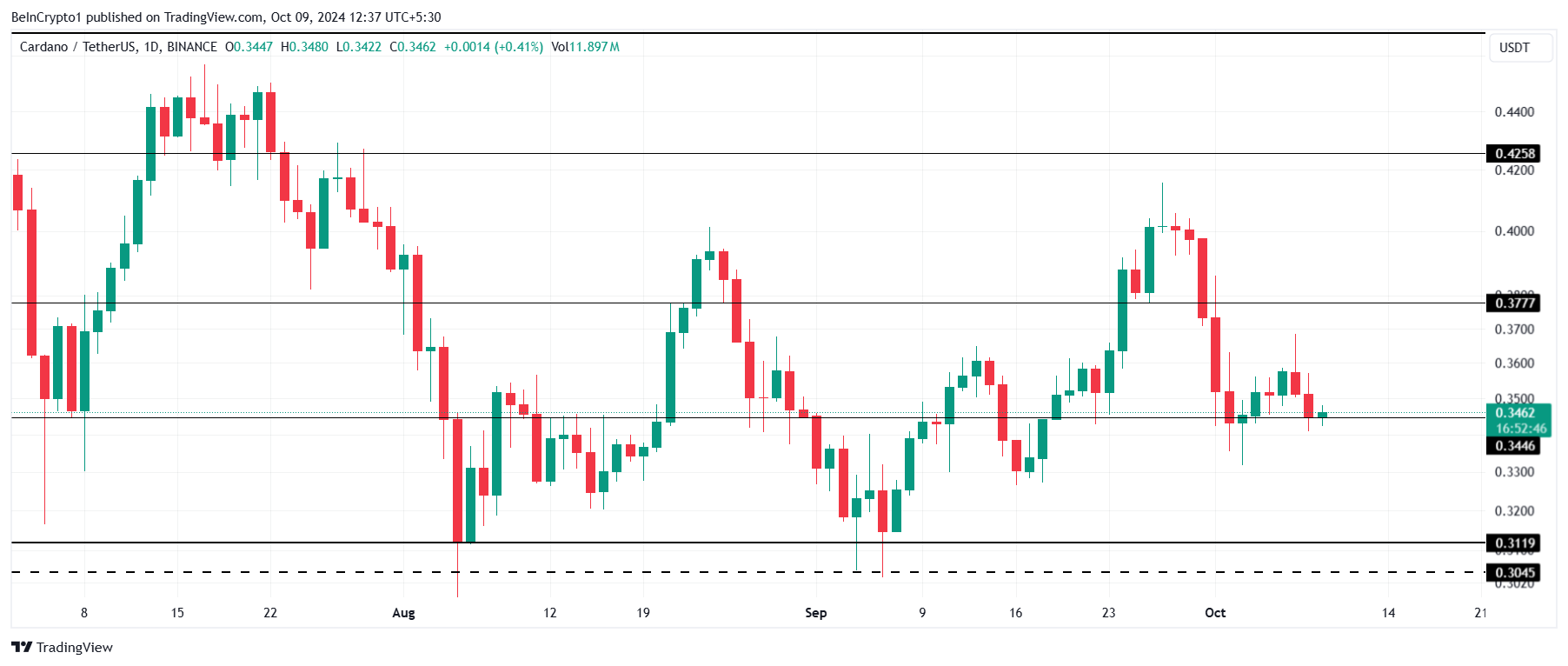 Entretanto, se a Cardano perder o suporte em US$ 0,34, o preço poderia cair para US$ 0,31. Assim, tal declínio invalidaria a perspectiva de alta, negando aos investidores seus lucros potenciais e estendendo as perdas atuais, levando a um cenário mais pessimista para os detentores de ADA.