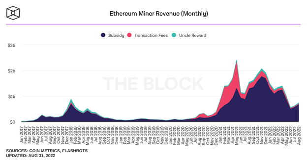 Como resultado, a receita de mineração Ethereum subiu para aproximadamente US$ 734 milhões em agosto. Em julho, esse montante foi de US$ 621 milhões, de acordo com o The Block com base em dados da Coin Metrics. Dessa forma, agosto viu um aumento de 18% na receita.
