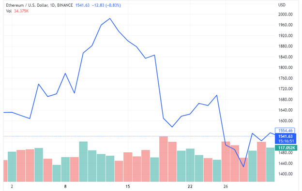 A redução prevista nas taxas de rede e o aumento no uso de protocolos descentralizados no Ethereum viram um aumento na demanda por ETH. No período, o token foi negociado na faixa de US$ 1.428 e US$ 2.023 após a abertura e fechamento em US$ 1.681 e US$ 1.554, respectivamente.