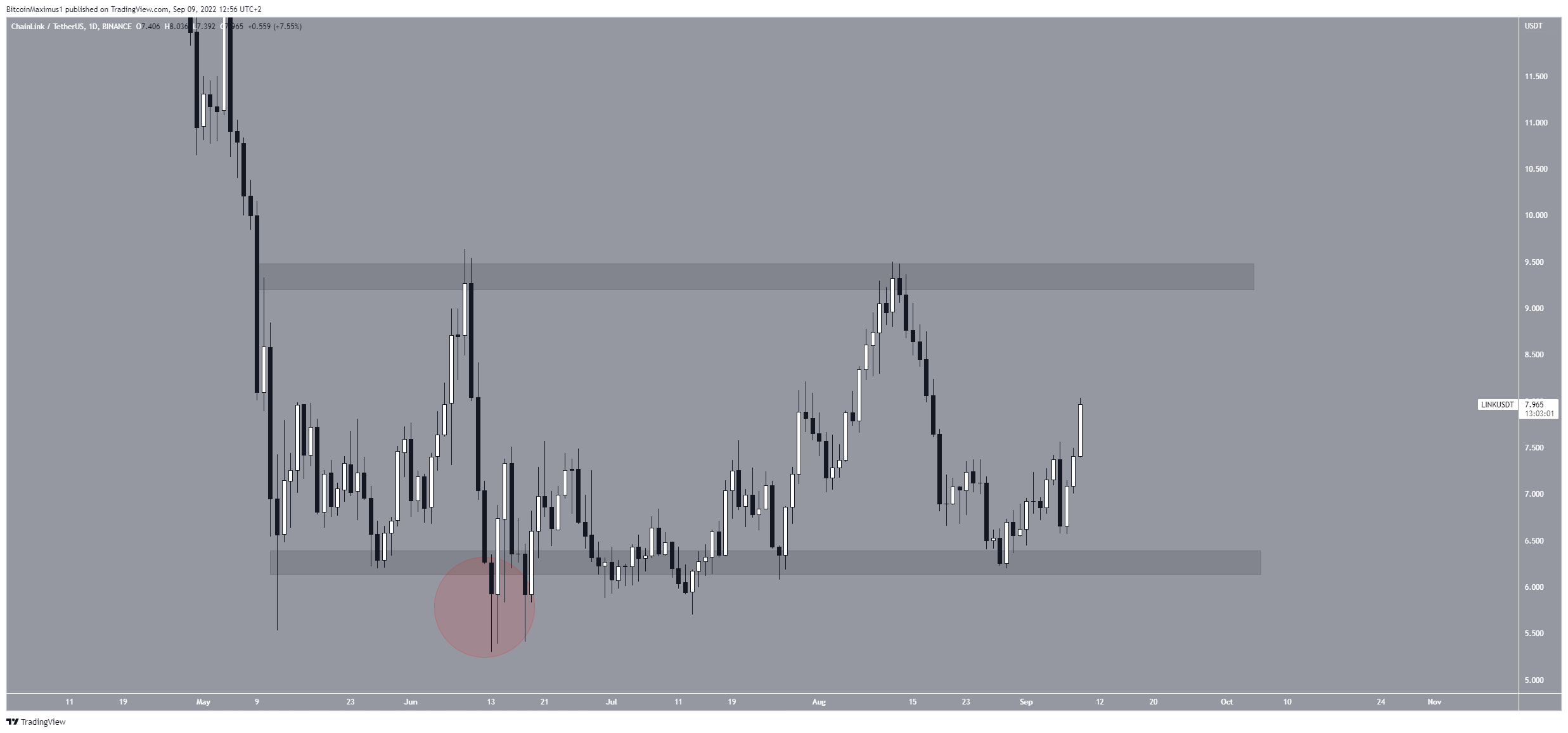 A LINK está negociada perto da área de suporte horizontal de US$ 6,20 desde 9 de maio. O token se desviou abaixo dessa área (círculo vermelho) em 13 de junho antes de recuperá-la.