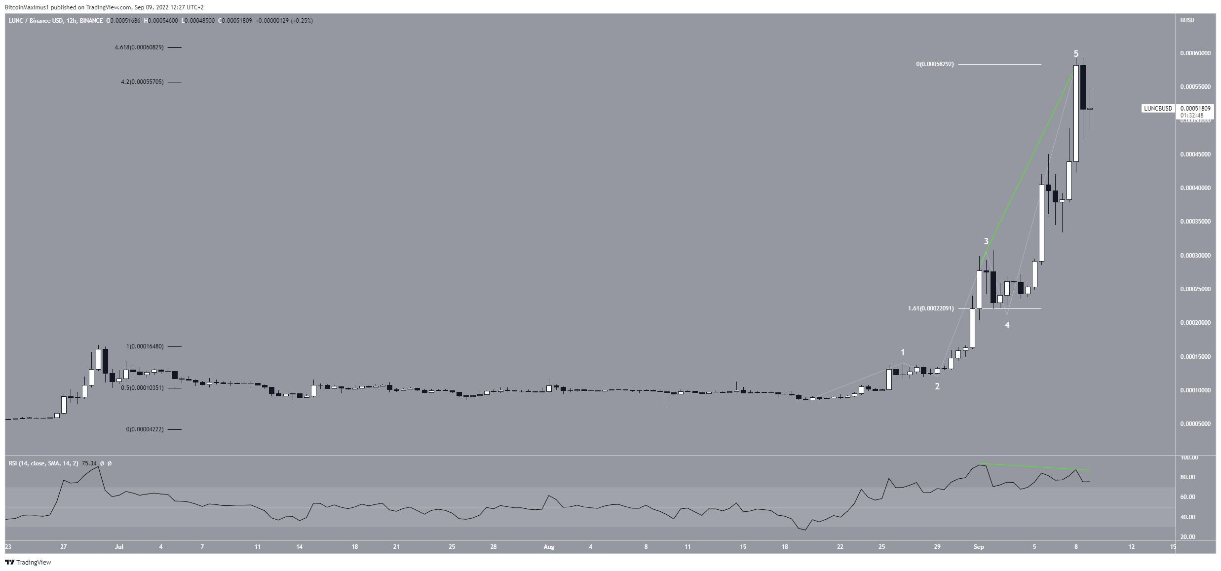 O preço da LUNC subiu consideravelmente desde 25 de agosto. O movimento até agora levou a um topo de US$ 0,00059 feito na quinta-feira (8).