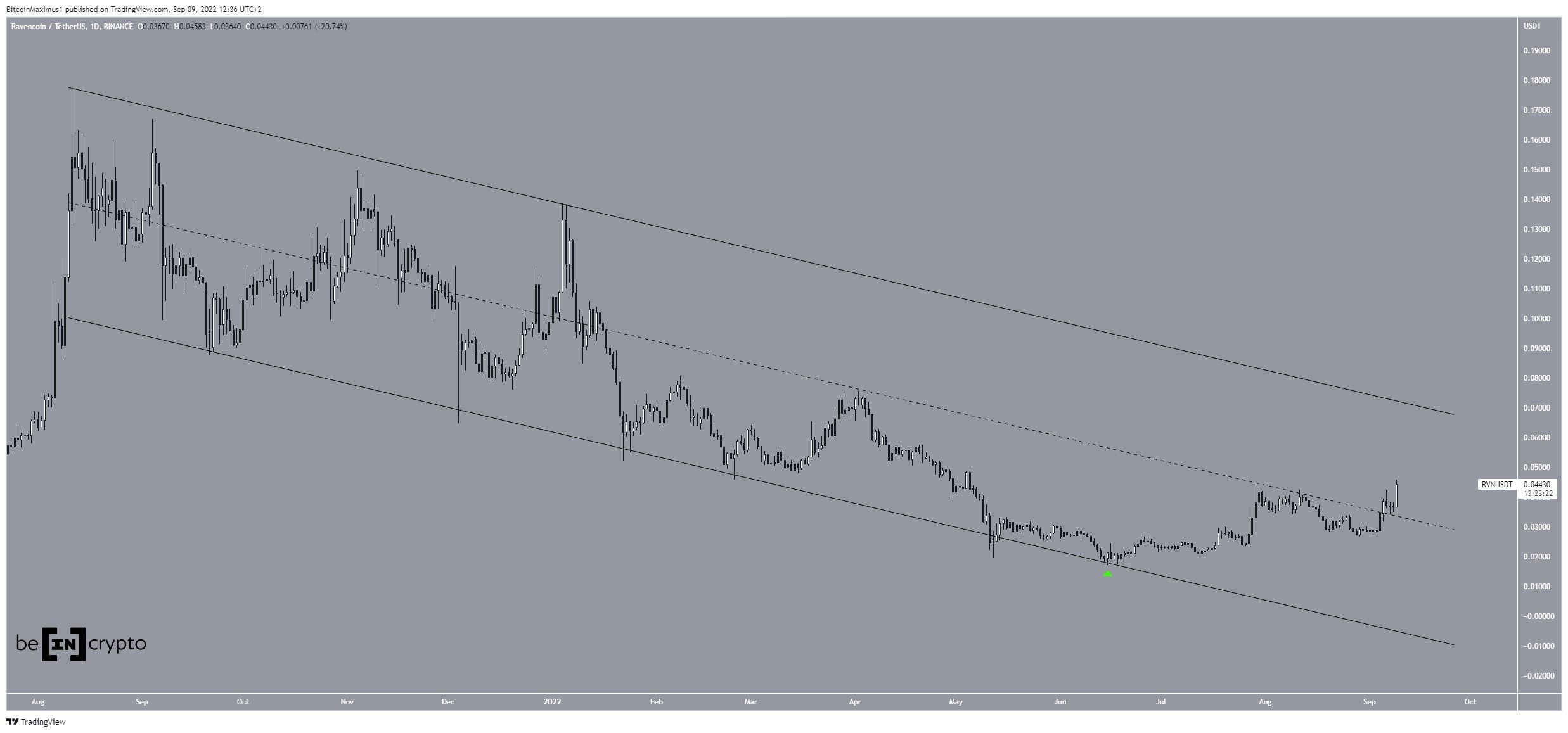O RVN vem caindo dentro de um canal paralelo de baixa de longo prazo desde agosto de 2021. O movimento levou a uma mínima de US$ 0,017 em junho. Seu preço tem subido desde então, recuperando o meio do canal na segunda-feira (5).