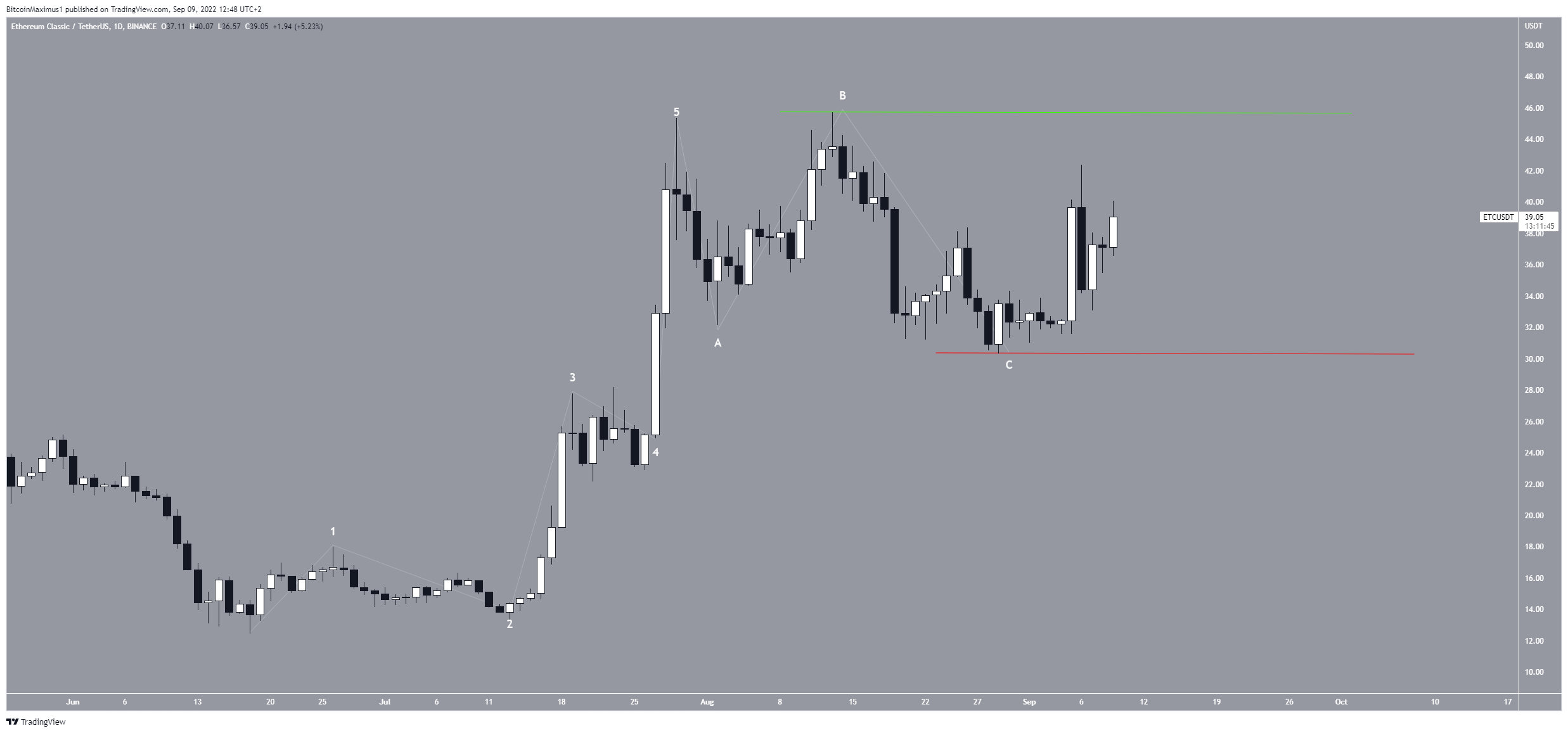 É possível que a alta anterior seja um movimento de alta de cinco ondas. Nesse caso, espera-se que o ETC suba em direção a novas máximas. Um rompimento acima da alta de US$ 45,36 (linha verde) confirmaria essa possibilidade, enquanto uma queda abaixo de US$ 30,34 (linha vermelha) a invalidaria.