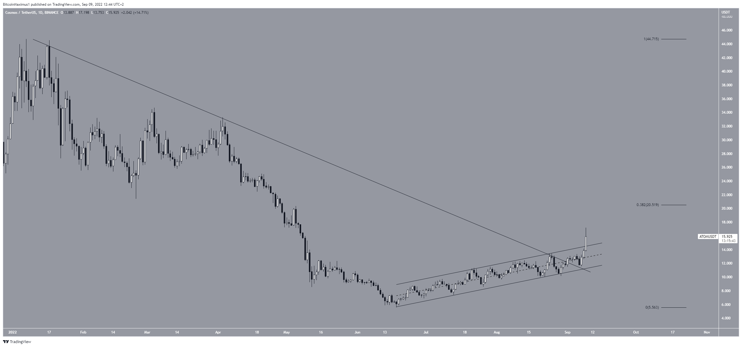A ATOM está subindo dentro de um canal paralelo de alta desde 18 de junho. Embora esses canais geralmente contenham movimentos corretivos, o token conseguiu romper dele na quinta-feira.